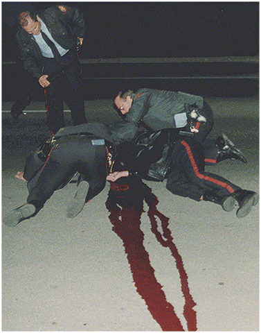 OFFICER SLAIN - Fellow officers try to help Cost. Robert Vanderwiel, who was shot to death September 22, 1992 in Calgary.