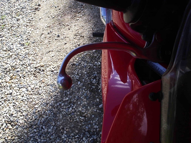 Thursday: Bent front brake lever after second mishap - bike falling over in soft soil.